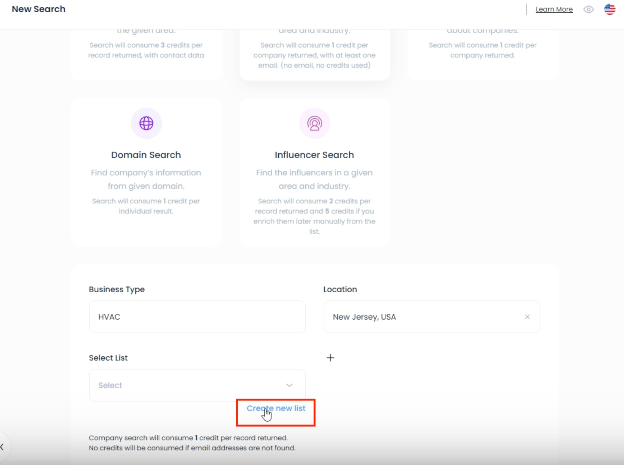 - 1. Navigate to Lead Search in your Lead Generation Tool dashboard.